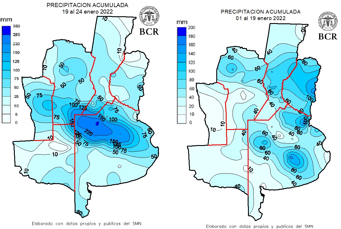 Si bien el norte de Buenos Aires recibió de 50 a 300 mm en los últimos cinco días, buena parte de la mitad sur de Buenos Aires acumuló menos de 25 mm, sobre todo el sector SO. El 70% de Córdoba recibió un alivio importante en los últimos cinco días, entre 50 a 75 mm, pero la franja central prácticamente no ha registrado agua desde que se inició enero del 2022. En Santa Fe, desde la autopista a Córdoba hacia el norte provincial, los registros de este último evento dejaron de 25 a 50 mm. Para alcanzar las medias pluviométricas de enero, en buena aparte del territorio santafesino hacen falta entre el 30 y el 40% de los 120 mm históricos de enero.