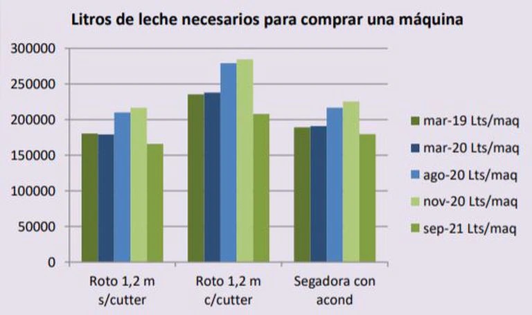 Así, en septiembre de 2021 se requerían 206.170 litros del producto para adquirir la máquina vs 284.725, que eran necesarios en noviembre de 2020 y 235.202 litros en marzo de 2019. La situación conveniente se repite con las otras máquinas forrajeras consideradas.