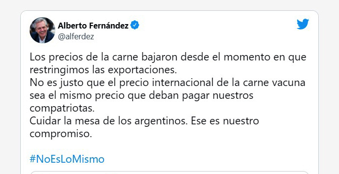 El Presidente había manifestado que «los precios de la carne bajaron desde el momento en que restringimos las exportaciones. No es justo que el precio internacional de la carne vacuna sea el mismo precio que deban pagar nuestros compatriotas. Cuidar la mesa de los argentinos. Ese es nuestro compromiso», indicó el Jefe de Estado.