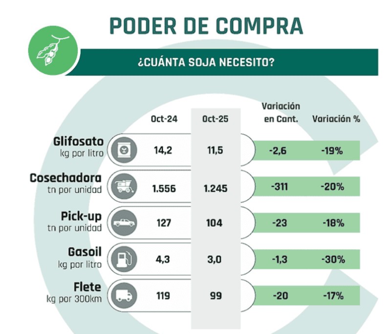 En octubre se observó una mejora respecto de la campaña anterior, aunque el balance sigue siendo dispar frente al promedio de los últimos cinco años. Las mayores ganancias se dieron en fitosanitarios, con un aumento del poder de compra del 13%, y en tierra: para adquirir una hectárea en zona maicera bastaron 57 toneladas de soja, 1% menos que un año atrás.