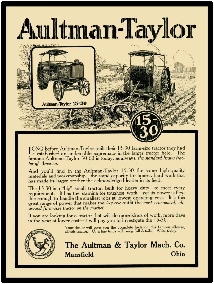 La fabricante Aultman & Taylor, además de fabricar trilladoras estáticas, fue muy conocida por construir distintos modelos de tractores; los cuales se diferenciaban por su potencia. El 15-30 fue el más chico de la familia.