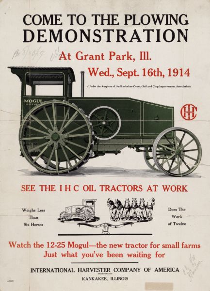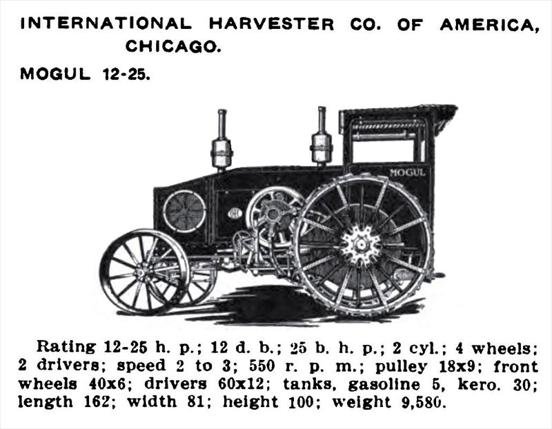 El Mogul 12-25 fue el primer intento de la IHC en fabricar un tractor del tipo liviano para los pequeños agricultores. Hay que recordar que en esa época aún se fabricaban y vendían los enormes tractores con motores a vapor.
