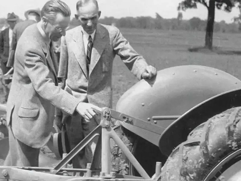 Foto en dónde se ve a Harry Ferguson mostrarle su invento a Henry Ford.
