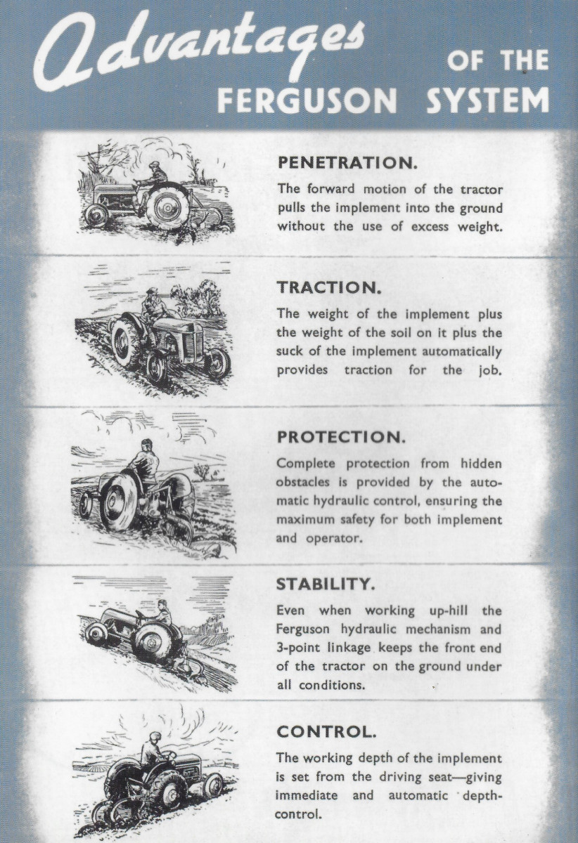 Lo cierto es que Harry Ferguson y sus colegas desarrollaron varias innovaciones para este dispositivo (por ejemplo, el control hidráulico de elevación y profundidad) que hicieron que el sistema fuera viable, efectivo y, además, deseable.
