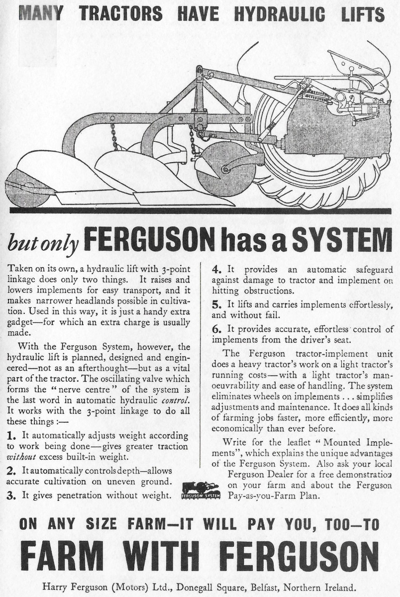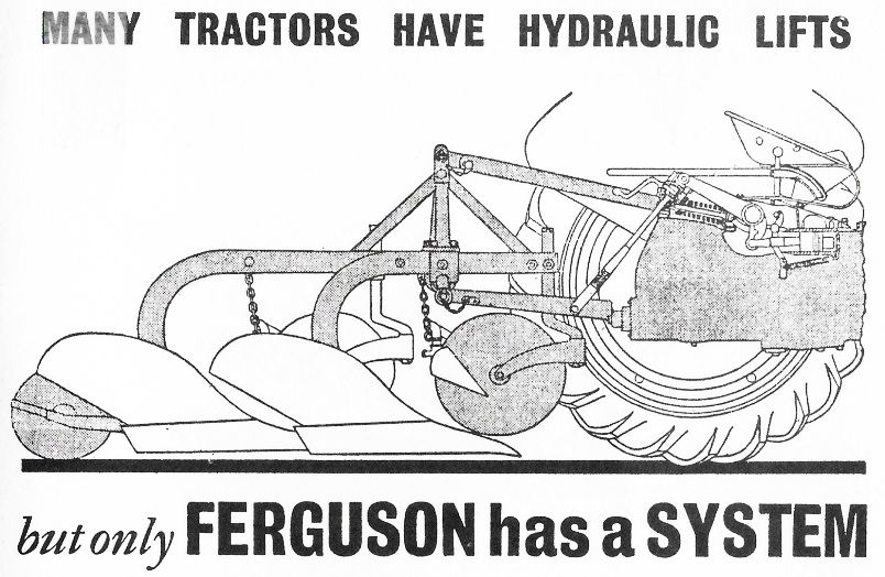 Publicidad de la época. En la misma se destaca el slogan: Muchos tractores tienen elevadores hidráulicos, pero solo Ferguson tiene un Sistema.