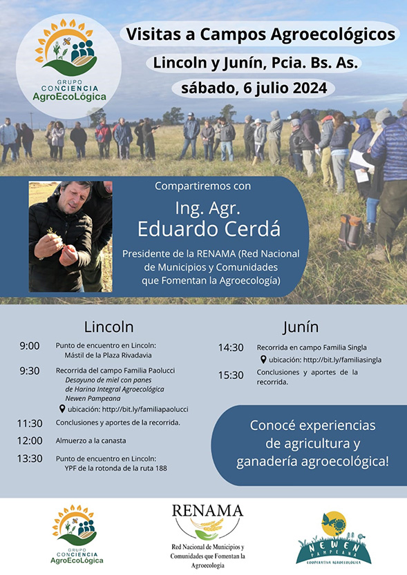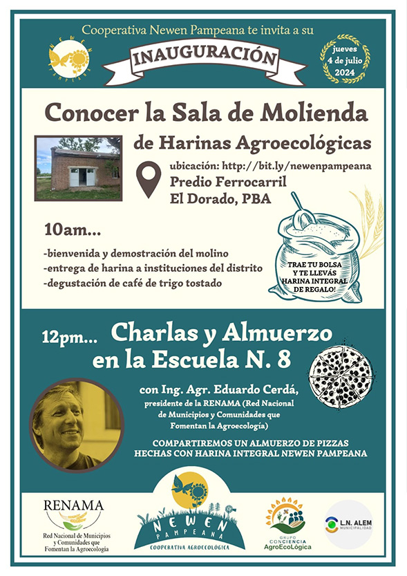 Las actividades comenzarán el día 4 a las 10 hs con una visita a la Cooperativa Newen Pampeana y a la inauguración de la Sala de Moliendas de Harinas Agroecológicas que se encuentra en el predio del Ferrocarril de la localidad de El Dorado (Partido de L. N. Alem). Luego habrá un almuerzo con productos agroecológicos y una charla a cargo del Ing. Agr. Eduardo Cerdá.