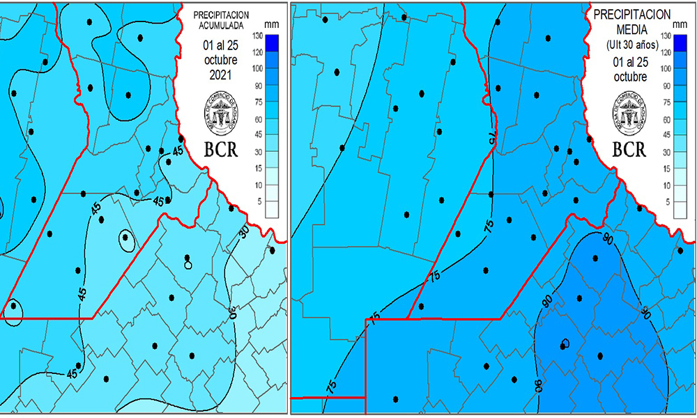 El NE bonaerense solo recibió la tercera parte de lo que indican las estadísticas de los últimos 30 años. Al este cordobés le fue mucho mejor y está muy cerca de la media. En el sur y centro sur de Santa de los 85 mm de media solo se recibieron 37 mm. A favor de octubre hubo lluvias que fueron claves y muy oportunas para el trigo y la siembra gruesa. Pero una vez más octubre no cumplió, y ya van 20 meses en que a nivel regional las lluvias no alcanzan las estadísticas entre el 2020 y en lo que va del 2021. Algunas excepciones son enero del 2021 con lluvias muy importantes o abril (2021) con un pulso muy fuerte que dejó inundaciones en el área de Marcos Juárez. Marzo de este año también dejó lluvias que fueron claves para el comienzo del trigo.