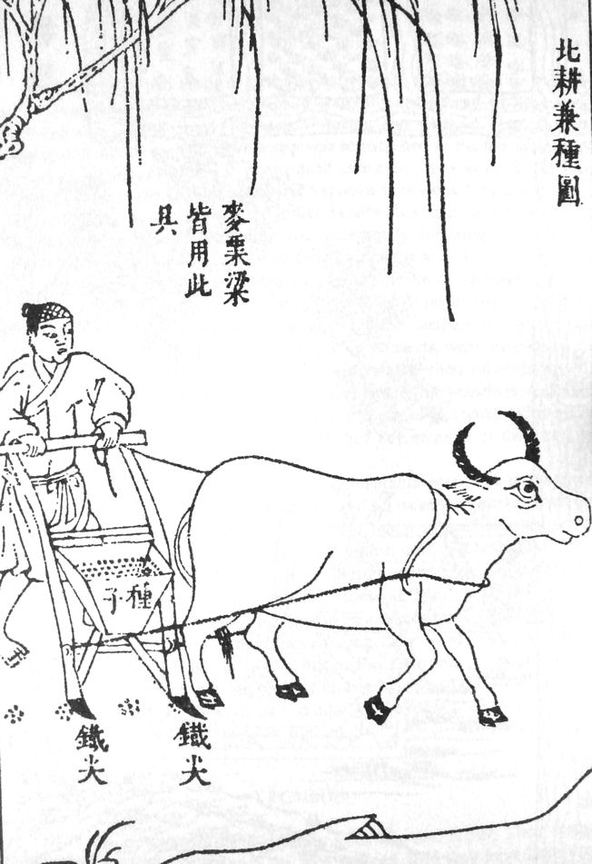 Sembradora china de doble tubo, publicada por Song Yingxing en la enciclopedia Tiangong Kaiwu de 1637.