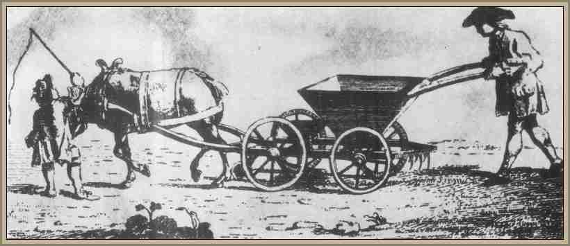 Sembradora ideada por William Ellis, en 1745. Llevaba dos depósitos, uno destinado a las semillas y otro al fertilizante, pero la máquina era de funcionamiento muy irregular.