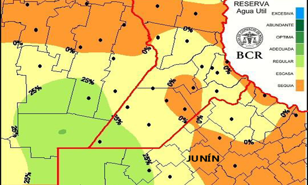 Según el nuevo informe de la Bolsa de Comercio de Rosario, más del ochenta porciento del distrito de Junín se encuentra “sin reserva de agua” y en situación de sequía. Explica también que para los próximos 15 días se necesitan lluvias de no menos de 80 a 100 milímetros.