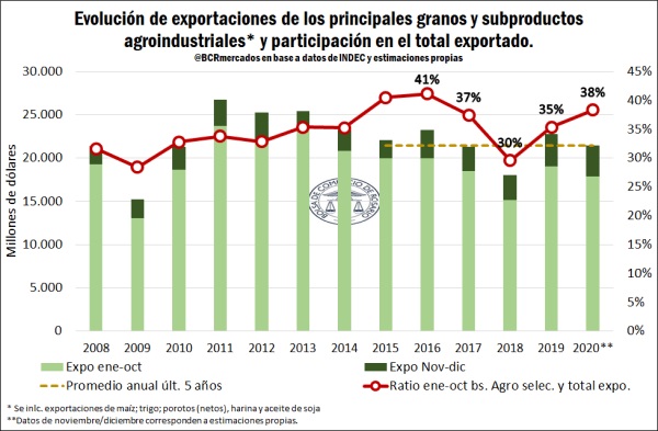 La participación del campo en las exportaciones creció 3% respecto al año pasado y 5% en comparación a 2018. De todas formas, el 38% del 2020 se ubica dentro del promedio de los últimos 5 años con un máximo del 41% alcanzado en 2016.