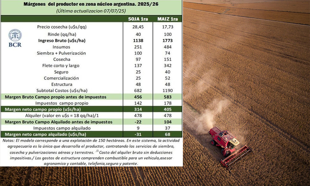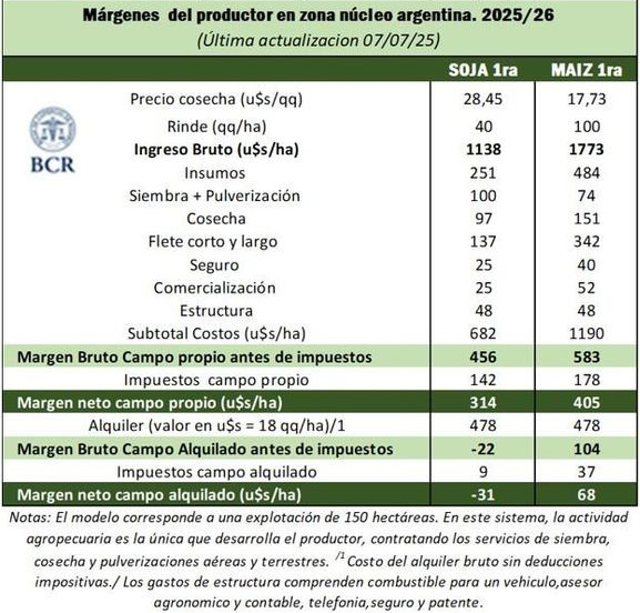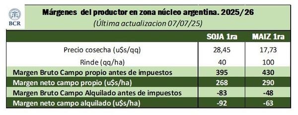 La entidad bursátil rosarina publicó los márgenes de rentabilidad de soja y maíz para la campaña 2025/2026. ¿Y con los alquileres qué pasa?