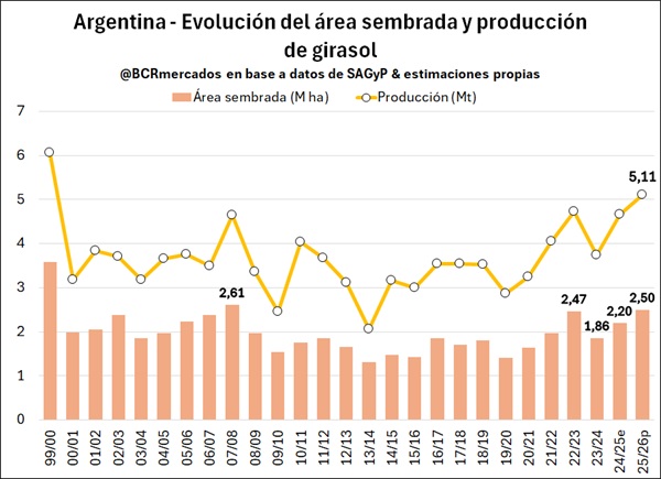 El cultivo de girasol se está expandiendo nuevamente en Argentina de la mano de buenas oportunidades comerciales, con un área sembrada que alcanzó 2,2 millones de hectáreas en la campaña 2024/25 y con perspectivas de que siga creciendo en el nuevo ciclo comercial 2025/26.