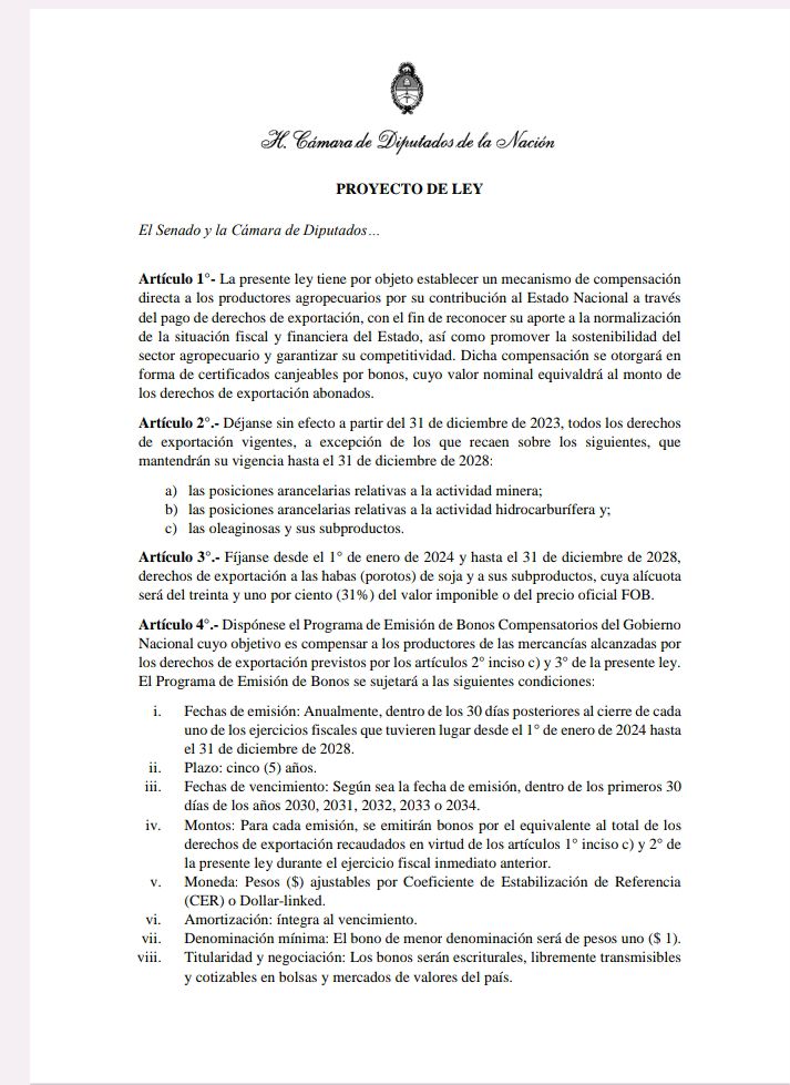 Habida cuenta que, no solo no reduce de forma importante los derechos de exportacion (propone bajarlo de 33 al 31%) sobre el principal cultivo argentino (la soja), sino que plantea un «bono compensatorio anual» por las Retenciones cobradas que sería pagado a partir del año 2030 y de forma anual hasta 2034.
