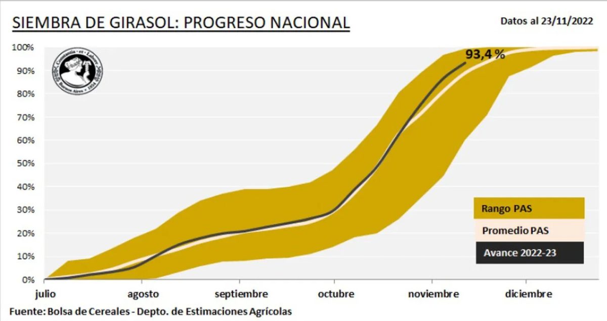 A la fecha, el avance de siembra se ubica en 16,7% de un área estimada para la campaña 2022/23 en 950.000 hectáreas., un 5 % inferior al ciclo previo, cuando se implantaron un millón de hectáreas. A la fecha, las labores registran una demora interanual del 9,4%.