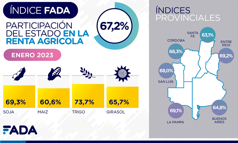 FADA (Fundación Agropecuaria para el Desarrollo de Argentina) publica su índice de manera trimestral desde hace ya 10 años. Este informe mide cuánto de la renta agrícola (ingresos menos costos) queda en manos estatales. Con respecto al trimestre pasado, el número creció 5,9 puntos porcentuales y arroja una participación de 67,2% para el promedio ponderado por cultivos. “¿Qué significa? Que por cada $100 de renta que genera una hectárea, $67,20 se va en impuestos”, explica Nicolle Pisani Claro, economista de FADA.