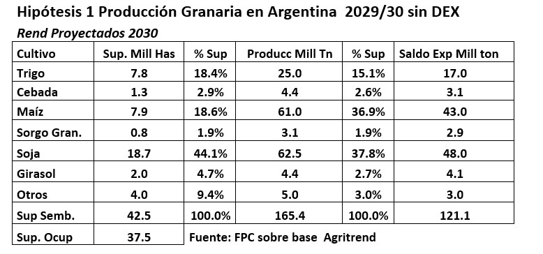 Tomando como base el resultado productivo de la campaña que se está cerrando 2021/2022 y la proyección realizada por la Fundación Producir Conservando al 2029/2030, señala que llegar a un área sembrada de 42,5 millones de hectáreas totales y una producción de 165 millones de toneladas, se pudo simular que ocurriría con el área y producción de cada cultivo si los DEX no estuvieran presentes y mejorara sustancialmente y en forma diferencial la rentabilidad de los distintos cultivos integrantes de la rotación.