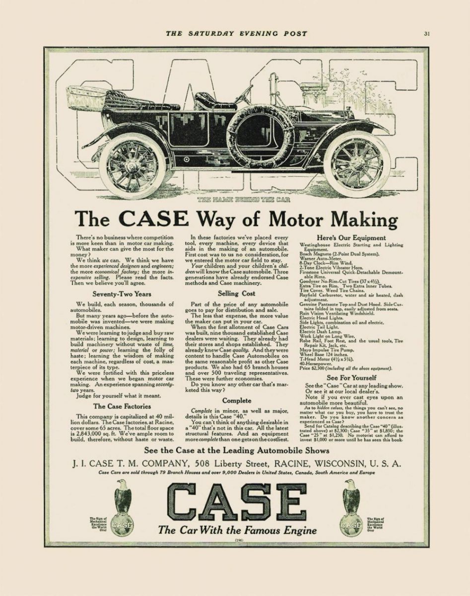 -En primer lugar, la J.I. Case Threshing Machine Co., entró en el negocio de la venta de autos en un momento muy competitivo.