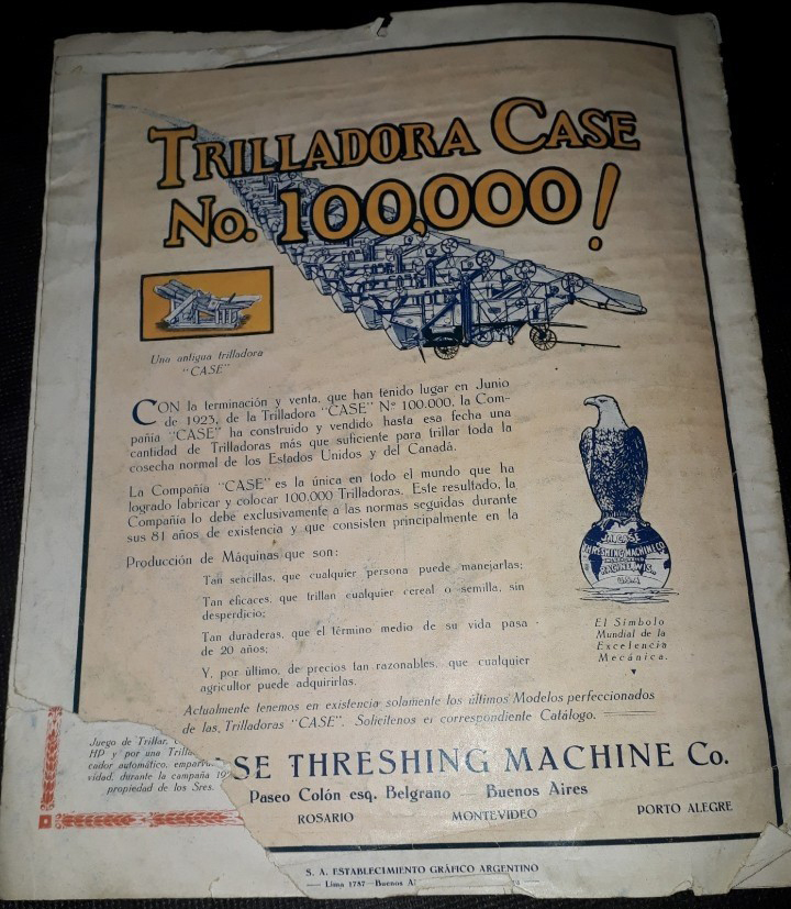En el año 1923 la empresa JI Case Threshing Co, promocionaba que había llegado a la fabricación y la venta de 100.000 trilladoras. En función de este acontecimiento la empresa con asiento en Argentina realizó un folleto publicitario alusivo.