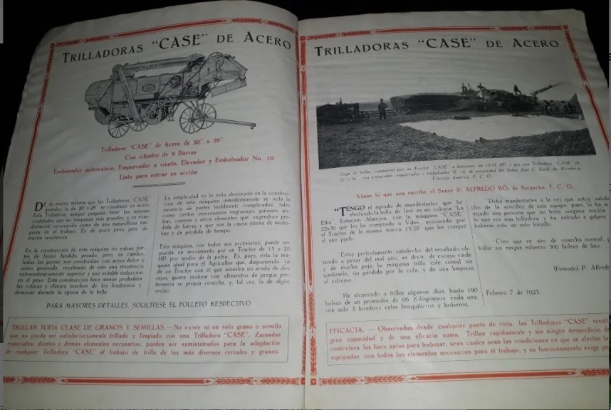 Por ejemplo el Sr. Alfredo Bo de la ciudad de Suipacha el 7 de febrero de 1923 dijo “Tengo el agrado de manifestarles que he efectuado la trilla de lino en mi colonia “La Elba” Estación Almeyda con la maquina CASE 22×36 que les he comprado el año pasado. Estoy perfectamente satisfecho del resultado obtenido a pesar del mal año, es decir de escaso rinde y de mucha paja: la máquina trilla este cereal sin quebrarlo, sin pérdida por la cola y de una limpieza al extremo. He alcanzado a trillar algunos días hasta 190 bolsas de un promedio de 66 kilogramos cada una, con solo 5 hombres entre horquilleros y bolseros. Debo manifestarles también que estoy satisfecho por la sencillez de este equipo… creo que en un año normal podré trillar sin ningún esfuerzo 500 bolsas de lino”.