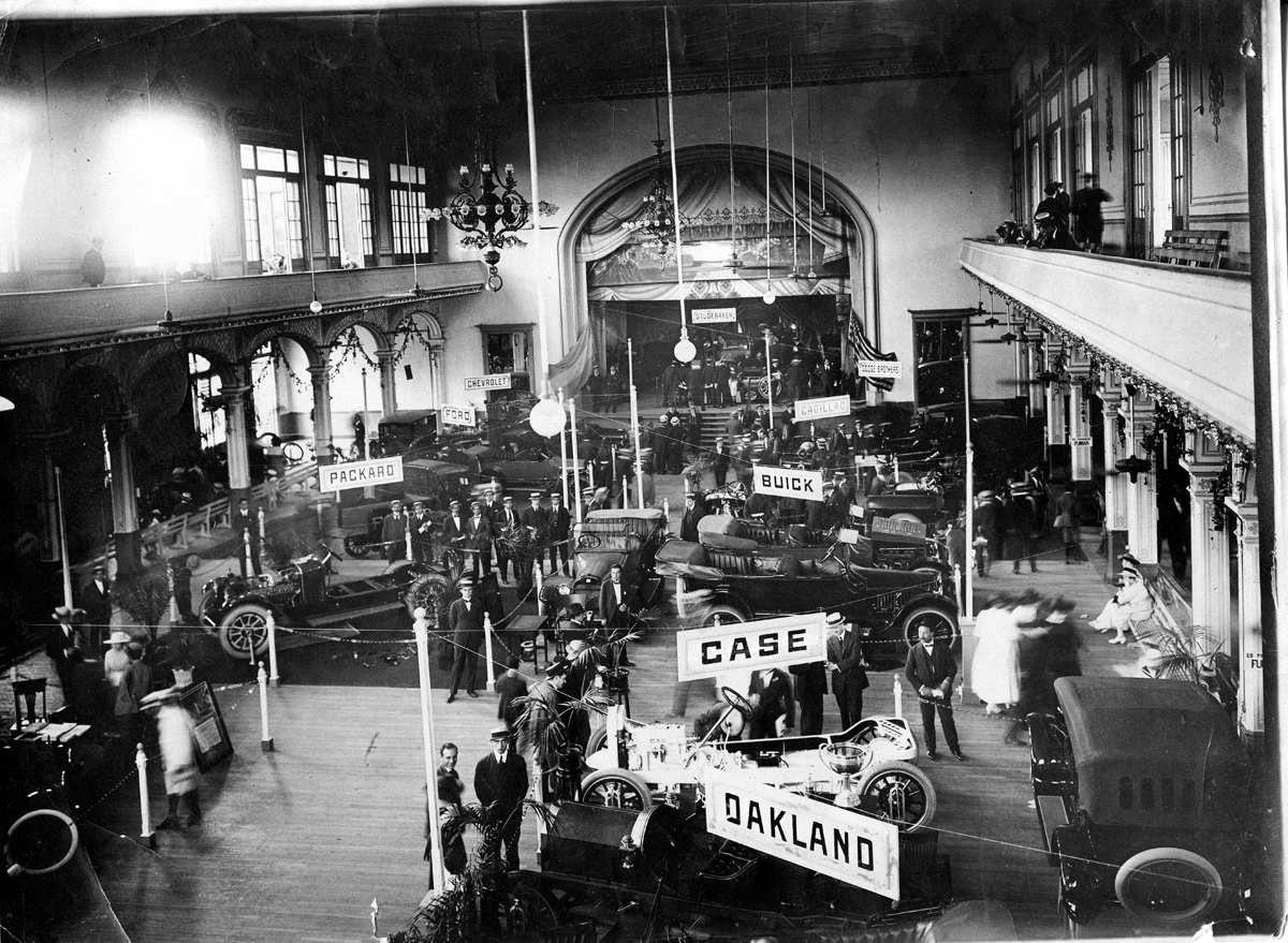 Foto del interior del Salón del Automóvil en Buenos Aires en el Pabellón de las Rosas de Palermo, del año 1918. Se puede ver que la empresa case estaba presentando uno de sus autos.