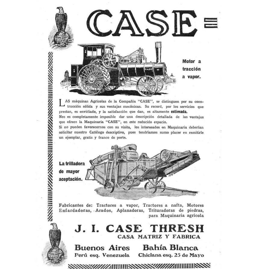 Otro dato interesante es que la J. I. Case, ya en 1919 había abierto una sucursal oficial en la ciudad bonaerense de Bahía Blanca. Las oficinas de la empresa estaban en calle Chiclana y 25 de Mayo, y el concesionario oficial en calle Brown esquina Fritz Roy de esa ciudad del sur bonaerense. Lo curioso es que en esa esquina funcionaba Agar Cross, por lo que se podría estimar que allí estaba la maquinaria y en el anterior domicilio las oficinas administrativas de Case.