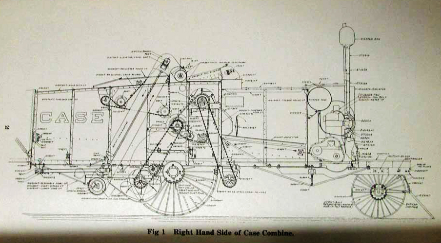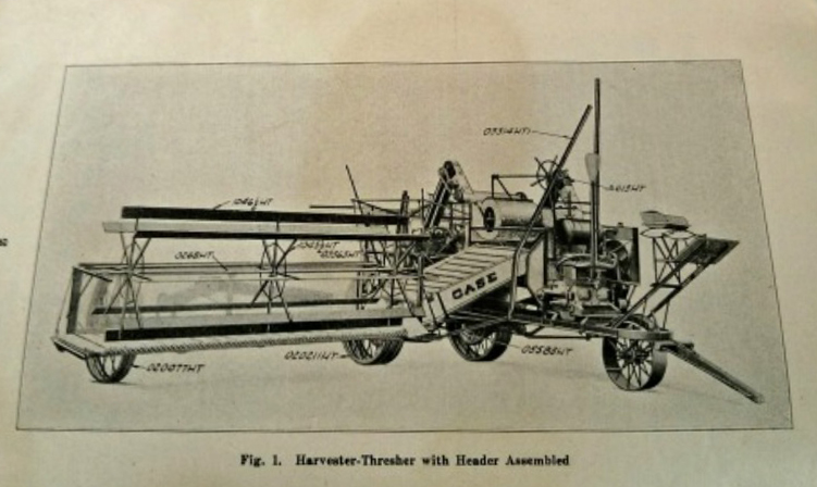 La antigua trilladora de la que me habló Miguel Orciani resultó ser una trilladora CASE modelo PA del año 1932, con cabezal de corte lateral de 16 pies de ancho, la cual era, en un principio, arrastrada por caballos y más adelante por tractor.