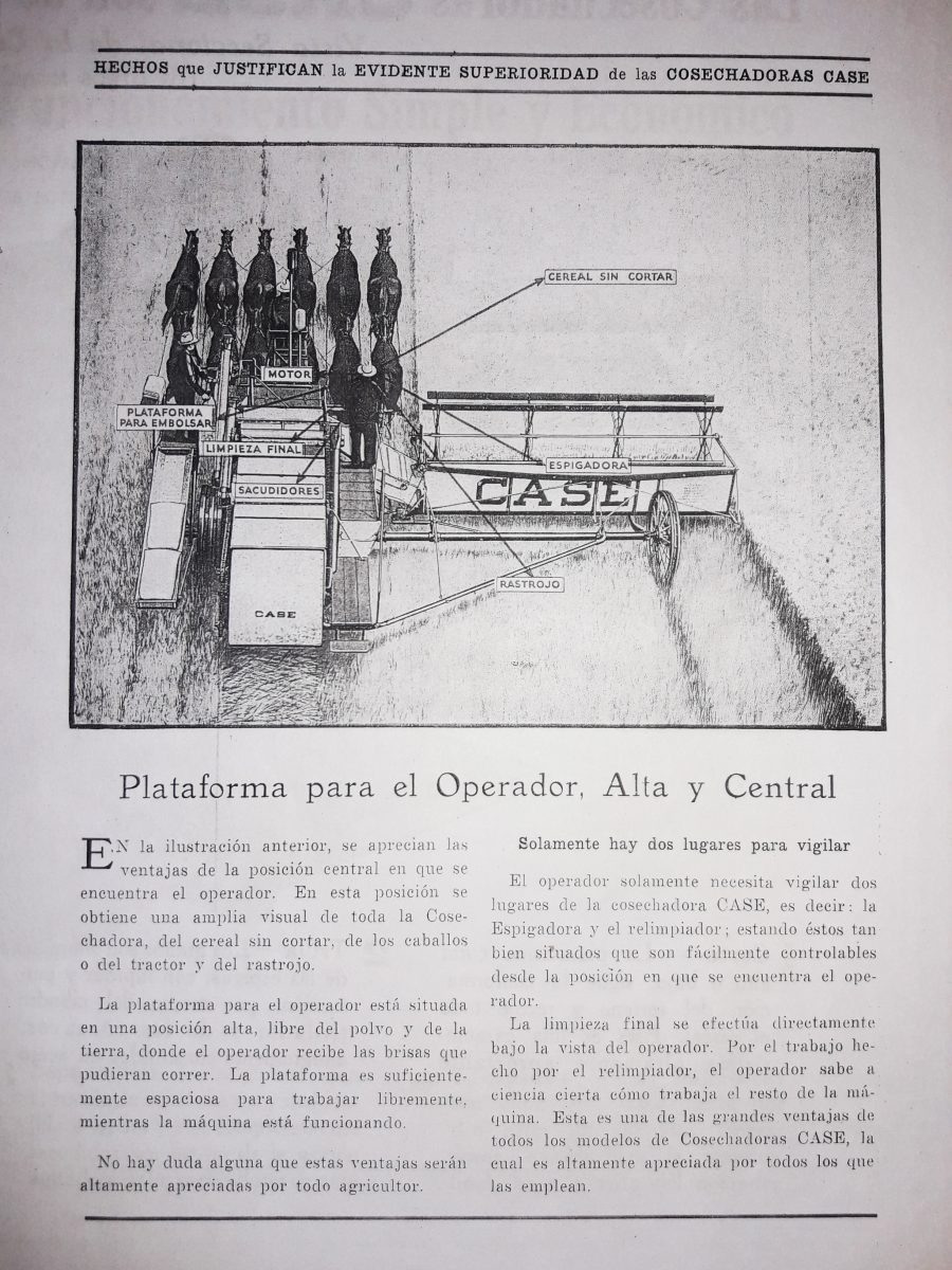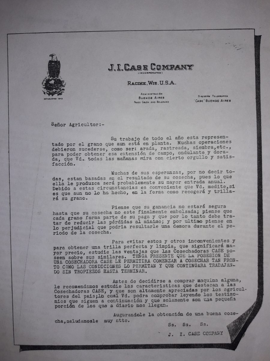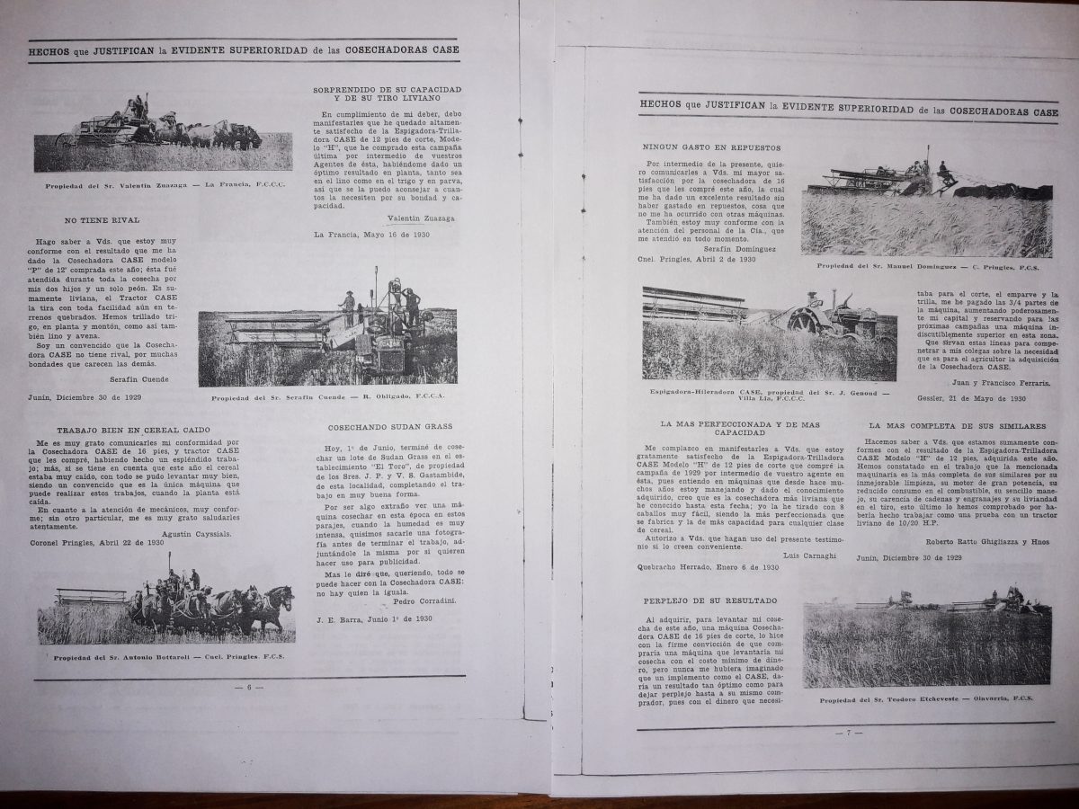 Por su parte un productor de Bahía Blanca (Buenos Aires), en su carta del 10 de mayo de 1928 escribió: “Me es grato manifestarles algunos datos de las tres máquinas cosechadoras Case que le adquirí a los señores Linares y Cia de Tres Arroyos. Coseché 1300 hectáreas de cereales entre avena, trigo y lino. Terminé de levantar la cosecha en 23 días de trabajo, a pesar de las malas condiciones y del terreno muy desparejo. La Plataforma articulada es un verdadero suceso en terreno desparejo y cereal bajo. Su gran capacidad de limpieza no deja nada que desear. La he tirado con 10 caballos fácilmente. Quedé muy satisfecho y autorizo a publicar, si lo creen conveniente”. Firmado: José Vizzolini.