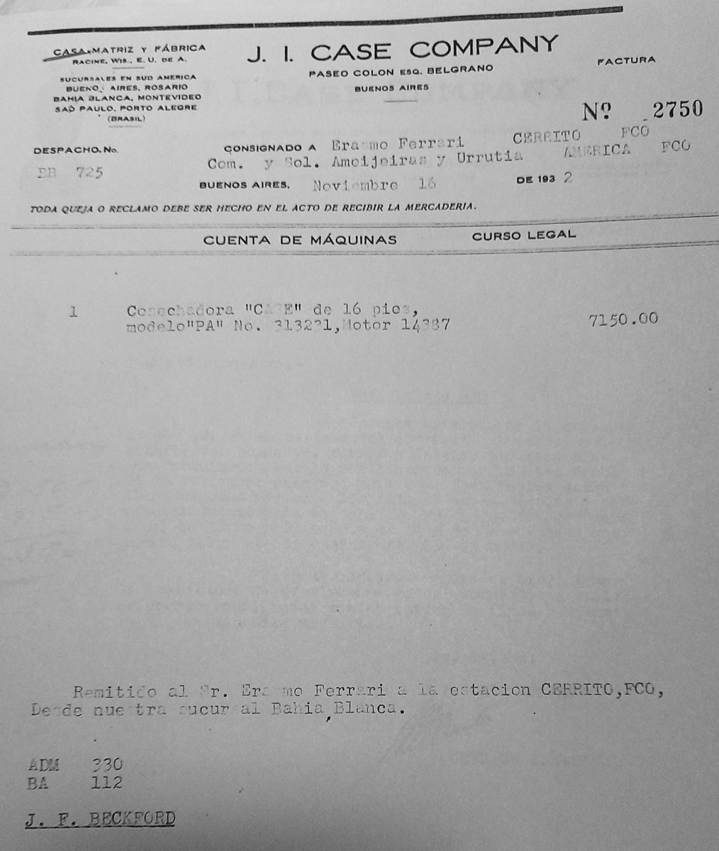 Ernesto Quintana, me facilitó una copia de la documentación original de la trilladora. Entre la documentación de la máquina se encuentra la factura de compra, la cual nos permite conocer algunos datos muy interesantes. Por ejemplo, la factura original que tiene el número 2750 indica que la máquina fue vendida por la J. I. Case Company ubicada en Av. Paseo Colón esquina Belgrano de la ciudad de Buenos Aires el 16 de noviembre de 1932. También se ve con claridad que fue adquirida por el Sr. Erasmo Ferrari de la Estación Cerrito ubicada en el partido bonaerense de Rivadavia. Otro dato interesante es que el precio que Ferrari pagó en 1932, fue de m$n 7.150 pesos moneda nacional.