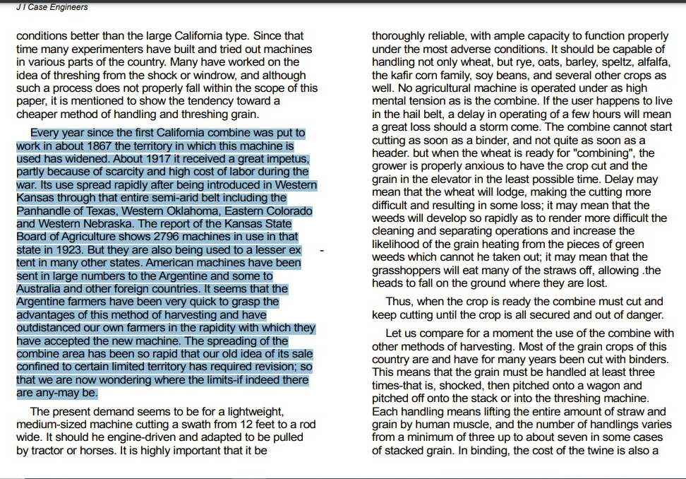 En la página 62 de ese escrito, más puntualmente en el segundo párrafo del texto, el Ing. Wallace McGregor escribió: “Todos los años desde que se puso en marcha la primera cosechadora en California, alrededor de 1867, el territorio en el que esta máquina se utilizado se ha ampliado. Hacia 1917 recibió un gran impulso, en parte debido a la escasez y el alto costo de la mano de obra por la guerra. Su uso se extendió rápidamente después de su introducción en Occidente. Kansas a través de todo ese cinturón semiárido, incluido el Panhandle de Texas, el oeste de Oklahoma, el este de Colorado y el oeste de Nebraska. El informe del estado de Kansas Board of Agriculture de 1923 muestra que son 2796 las máquinas en uso en ese estado. Pero también se están vendiendo en muchos otros estados. También estas máquinas americanas han sido enviadas en gran número a la Argentina y algunos a Australia y otros países extranjeros. Parece que los agricultores argentinos se han apresurado y comprenden las ventajas de este método de recolección y han distanciado a nuestros propios agricultores en la rapidez con que han aceptado la nueva máquina”.