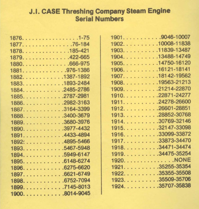Ahora te vamos a contar sobre otros modelos; puntualmente los más vendidos por la empresa de Racine. Lo primero para comentar es que, según la propia empresa J.I. Case Company, la primera serie de tractores a vapor comenzó en 1876 con un modelo de motor del cual el número de serie comenzaba en el 1 y terminó en el 75. En total, entre 1876 y 1900, la empresa fabricó 20 series distintas de tractores a vapor, los cuales iban del 1 al 9045. La empresa también destaca oficialmente que cerró la fabricación de estos modelos a vapor en el año 1924 con la serie que iba del 35.707 al 35.838.