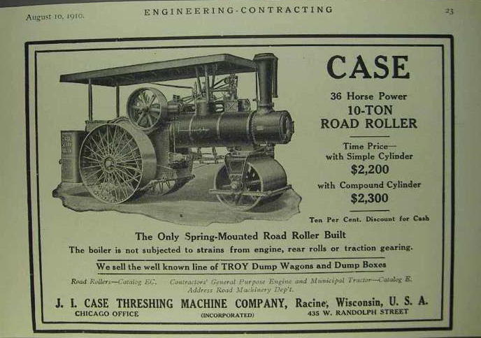 CASE fabricó, a lo largo de casi 50 años, distintos modelos de motores a vapor. Los fabricaron desde los 9 a los 110 HP (cabe indicar que el famoso modelo de 150 HP fue solo experimental y se construyeron apenas unas pocas unidades). También fabricó, en 1910, uno denominado Road Roller para uso en compactación de caminos y carreteras que poseía la rueda delantera con trocha ancha construida totalmente en hierro.