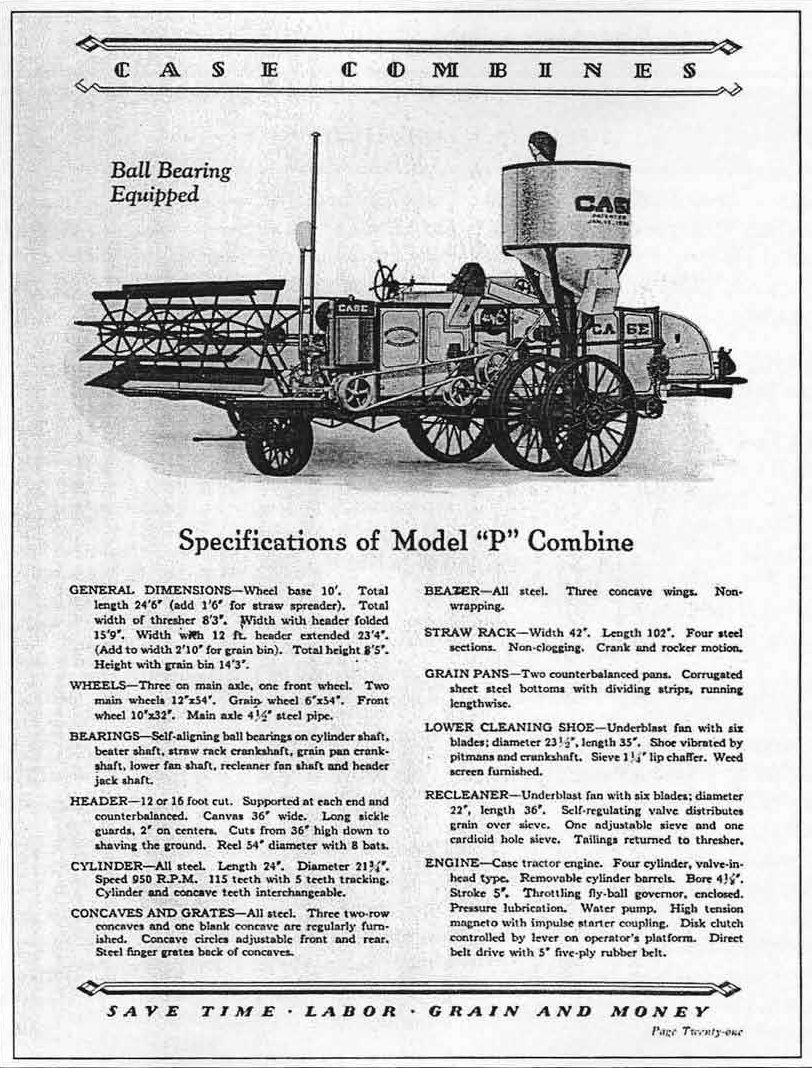 Cabe indicar que en esos momentos la más chica de las nuevas trilladoras CASE, el modelo AGITATOR 28 x 46, cuando estaba completamente equipada con las nuevas mejoras, requería 34 HP para funcionar a la máxima eficiencia.