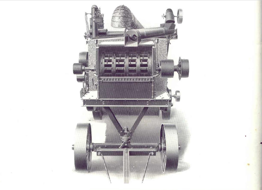 Destaca también la foto que el motor a vapor era hasta 18 HP y su valor era de 500 dólares. Por su parte también indica que el “Separador” o trilladora está construido en acero y que posee un cilindro de 18 x 36 pulgadas con accesorios de alimentación manual y un apilador plegable. Este Separador tenía un precio de 380 dólares, lo que totalizaban los 880 dólares de combo total. Es muy probable que este folleto sea de aproximadamente el año 1910.
