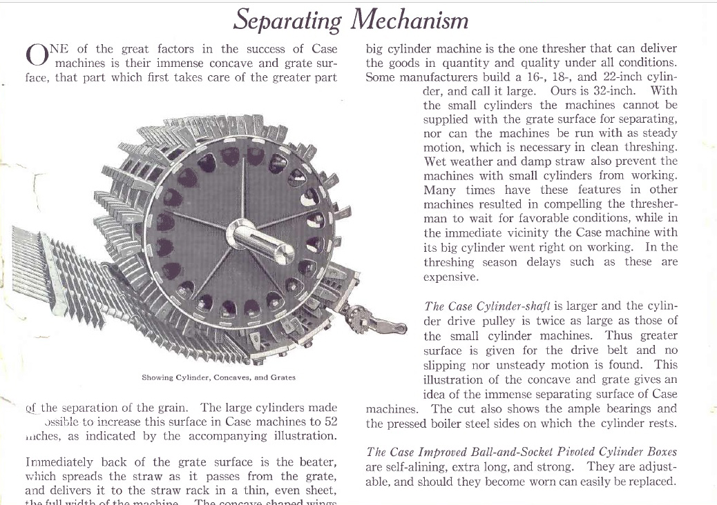 En el mismo folleto se observa en la parte superior izquierda una máquina trilladora construida en chapa con la frase que dice: “Case fire proof Steel”, que significa “Case de acero, a prueba de fuego” y lo más curioso es que en la parte inferior derecha del folleto aparece una trilladora incendiándose con la frase que indica “Wood separator”, que es “Separadora de madera”. De esta forma, clara y concisa, lo que estaba haciendo CASE con este folleto y esas frases era justificar el cambio de los materiales de la que fabricaba hasta ese momento. Aunque hay que decir que el cambio no se hizo inmediatamente, pues las de madera se seguían fabricando igual dado que eran más económicas que las de chapa.