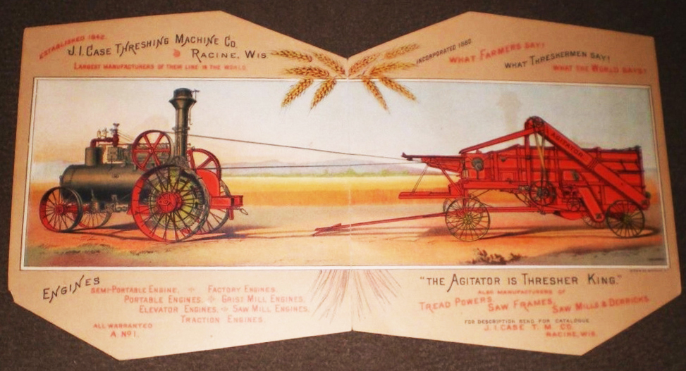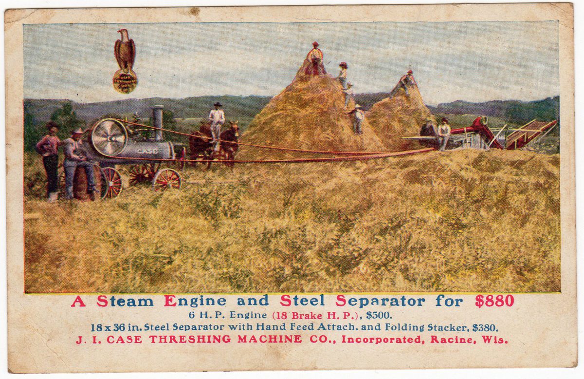 También se puede apreciar una foto, en realidad una tarjeta postal, en dónde se puede observar cómo era la forma en que la empresa vendía estas herramientas. Concretamente ofrecían el motor a vapor y la trilladora juntos. El folleto dice: “A Steam Engine and Steel Separator for $880”, es decir que la JI Case ofrecía una máquina de vapor y un separador construido con estructura de acero forrada de chapa galvanizada por 880 dólares ambos equipos.