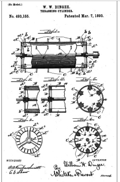 El primero es una sopladora neumática para la limpieza de granos en la trilladora que fue patentada bajo el número 571898 en el año 1896 el cual fue el elemento distintivo en la obtención de granos limpios en diferentes máquinas que luego fabricó la compañía americana. El siguiente es el cilindro de trilla con dedos patentado bajo el número 893155 realizado por el ingeniero William Dingee para la JI Case en 1893.