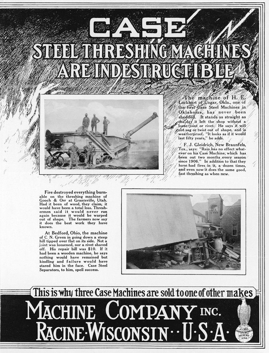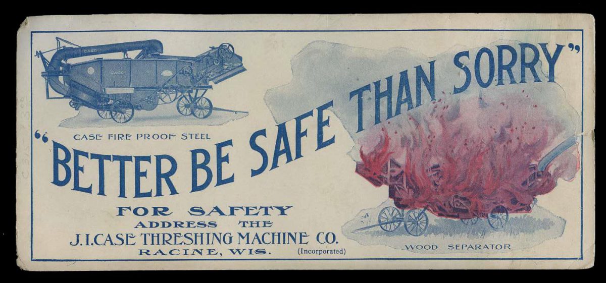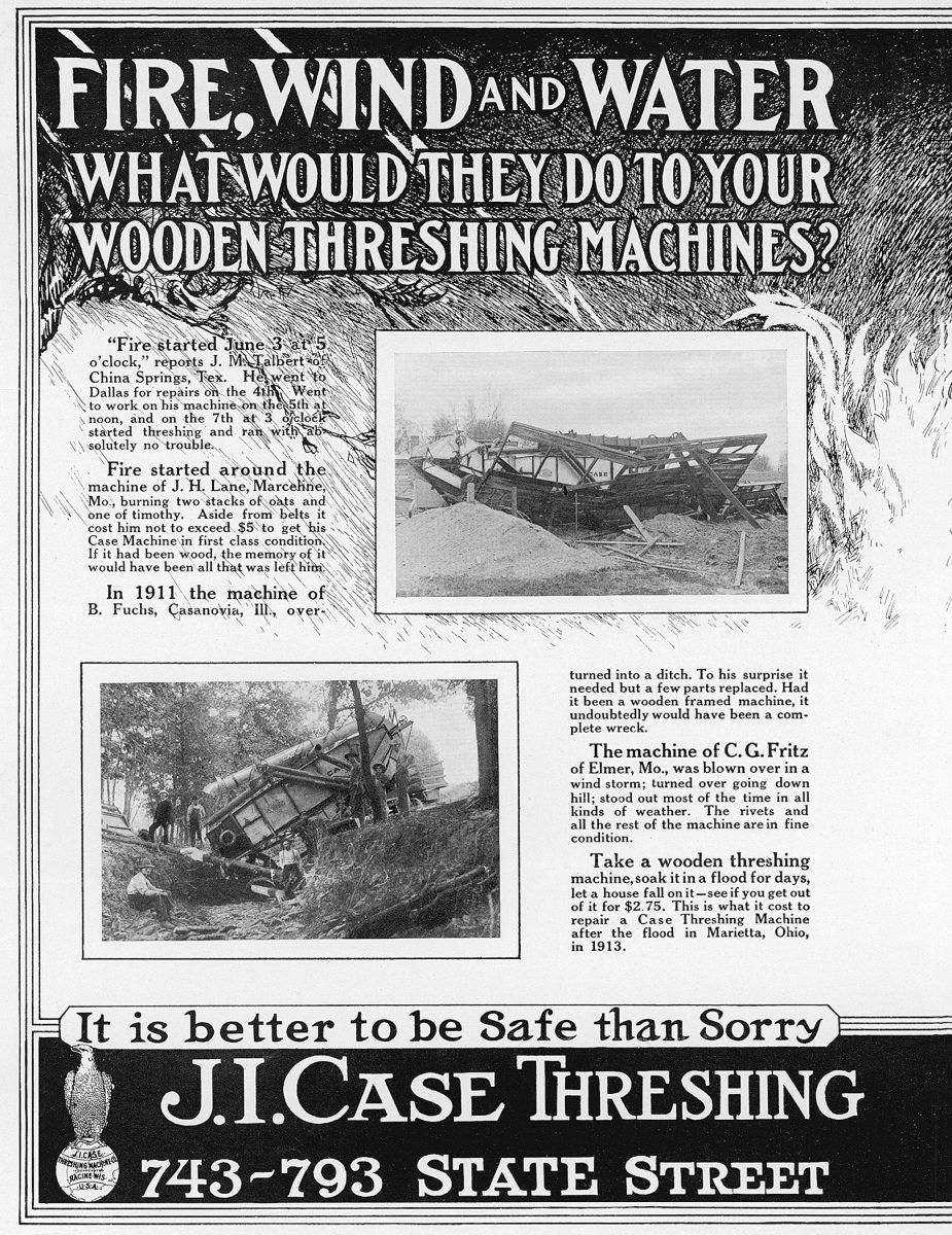 El folleto está titulado: «Fuego, viento y agua. ¿Qué les harían a sus trilladoras de madera?» Y en el mismo cuenta que el «Fuego estalló alrededor de la máquina de J. H Lane, Marceline, Missouri, quemando dos pilas de avena y una de Timothy. Aparte de las correas, solo le costó $ 5 poner su máquina Case en condiciones de primera. Si hubiera sido de madera, el recuerdo habría sido todo lo que le quedaba».