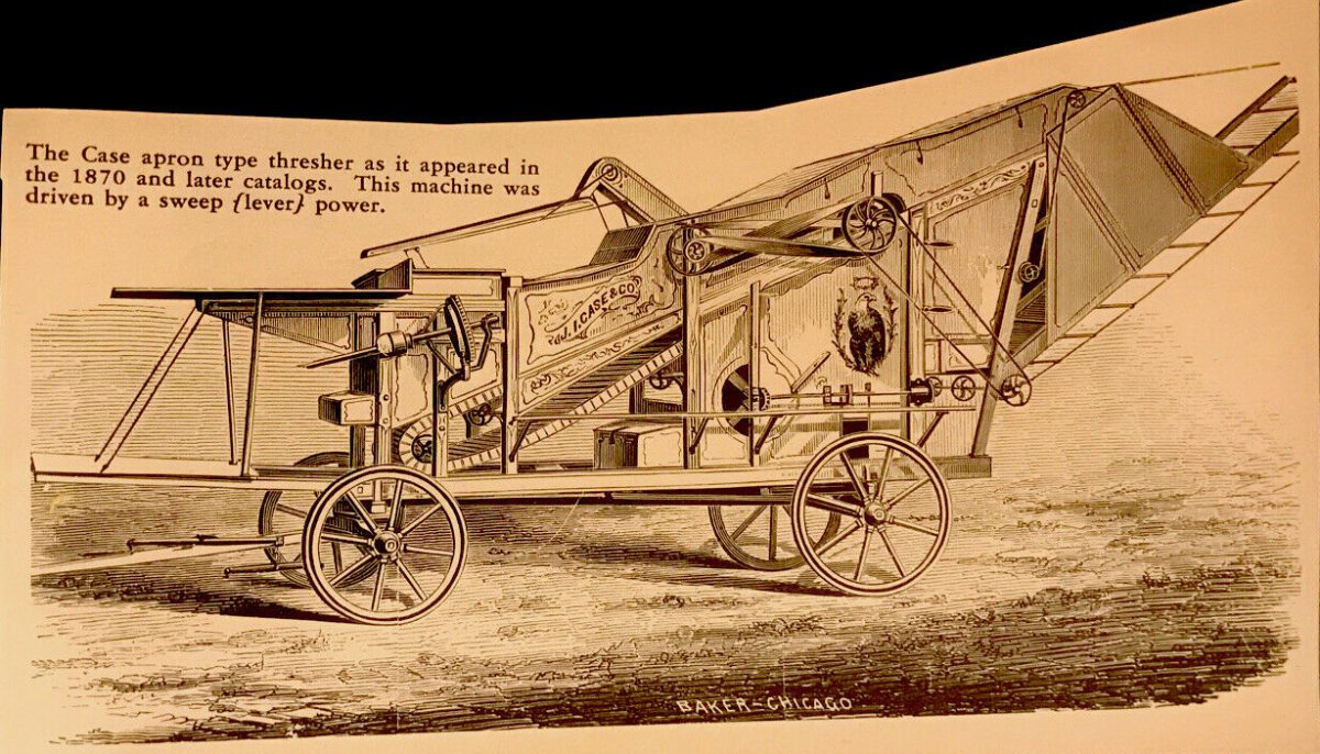 Lo primero que vamos a contar y repetir es lo que adelantamos en el Capítulo 7 de esta historia. Allí describimos las tres primeras trilladoras estacionarias marca CASE fueron el separador APRON (o Delantal) de 1862, que se fabricó en 8 modelos diferentes.