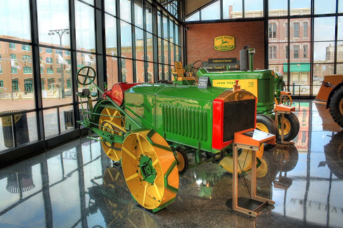 Foto de un tractor John Deere modelo Dein en el interior de la fábrica. Este tractor tenía un precio de 1200 dólares, lo cual fue considerado muy caro para la época por lo que su proyecto fue dado de baja.