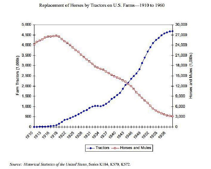 Cuadro en donde se ven las curvas de aumento en la incorporación de tractores y la disminución de la tracción animal en las granjas de Estados unidos entre los años 1910 y 1960.