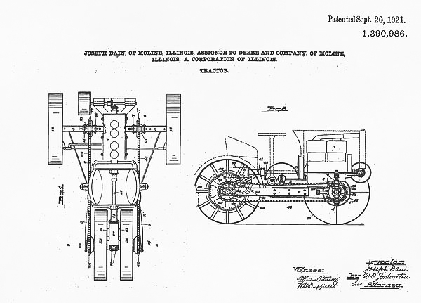 Plano del tractor Dein firmado por Joseph Dain con asignación a la empresa John Deere. Está fechado el 20 de septiembre de 1921.