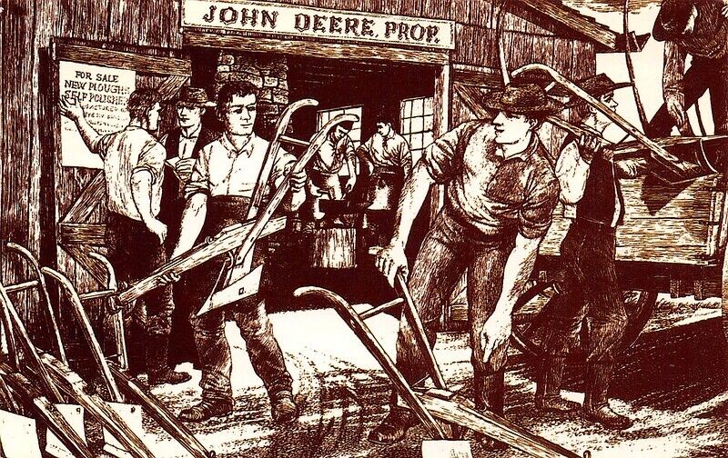 Recordemos que John Deere era nativo del pueblo de Rutland, Vermont, donde nació el 7 de febrero de 1804. Deere llegó al oeste en 1837 y se estableció en el poblado de Grand Detour. Aquí montó su primera herrería y al año siguiente construyó su casa y trajo a su familia a vivir con él. Tanto él como Leonard Andrus, que también era de Vermont, lograron traer a otros colonos a Grand Detour y pronto el pueblo se convirtió en una próspera comunidad.
