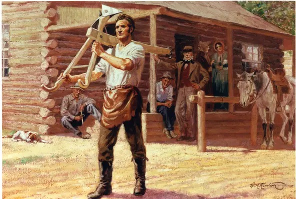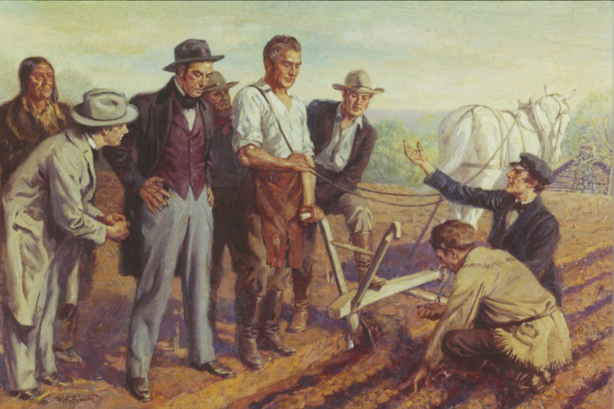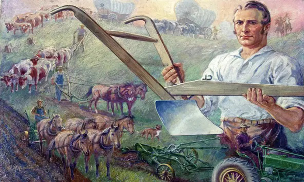 Así imaginaba Walter Hinton a John Deere, pues lo pintó con un arado al hombro.