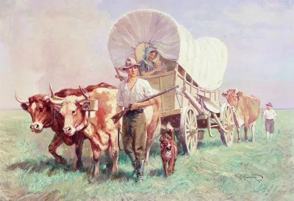 Probalemente la mejor pintura de Walter Hinton. Se ve a un hombre que traslada a su familia hacia el oeste fértil en una carreta. Al costado se ve amarrado un arado fabricado por John Deere.