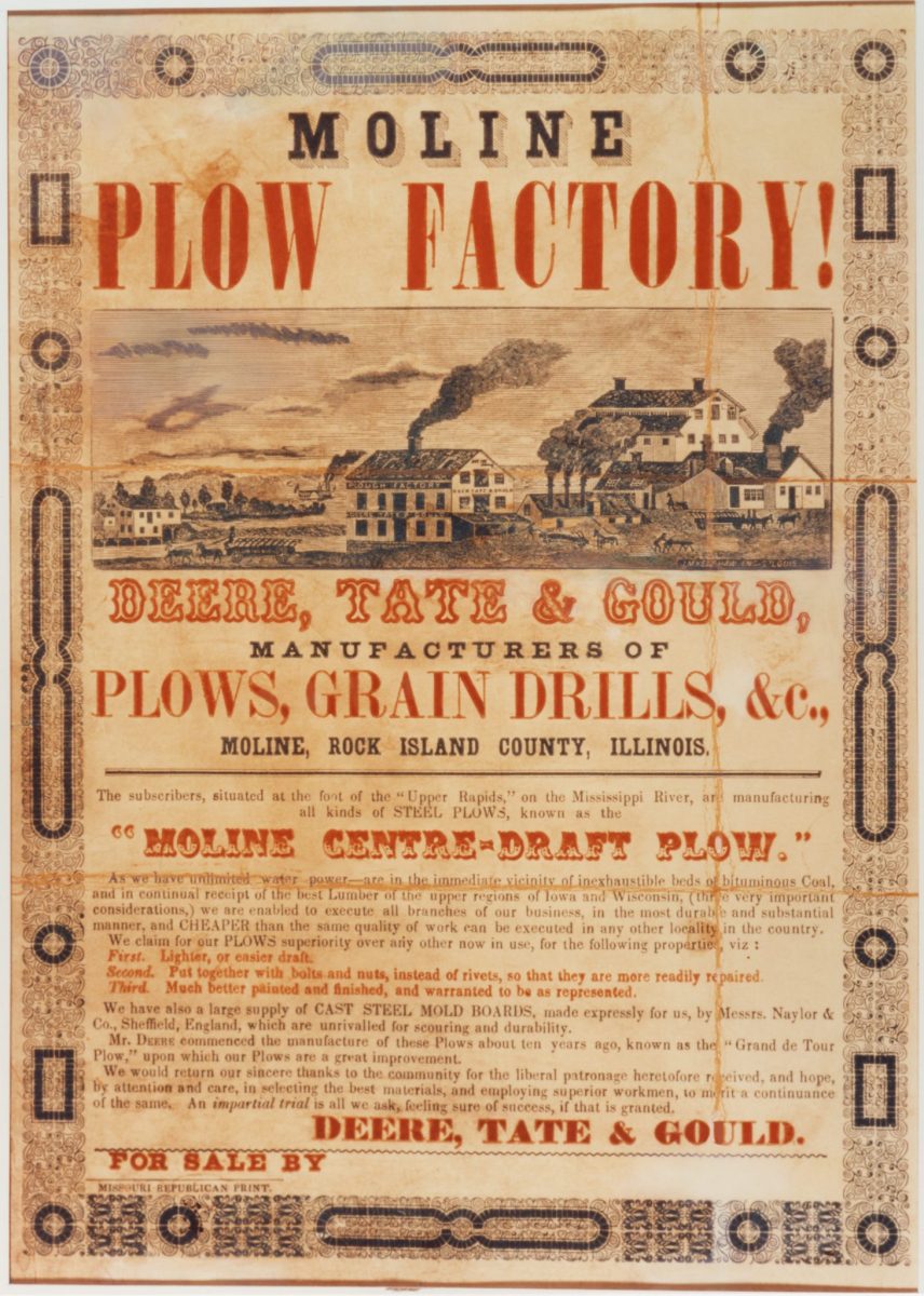 La empresa se dio en llamar “Deere, Tate & Gould Manufacturers of Plows Graind Drills Co”. Al margen del largo nombre lo cierto es que al año siguiente del nacimiento de la nueva compañía duplicó la producción de arados.
