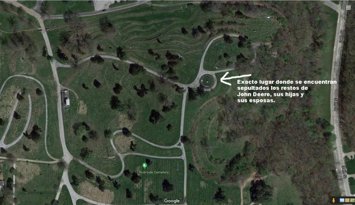 Finalmente, y como una curiosidad para este capítulo, hay que indicar que el lugar donde se encuentran sepultados los restos de John Deere está ubicado en una especie de rotonda dentro del Cementerio de Riverside de Moline en Rock Island County, Estado de Illinois.