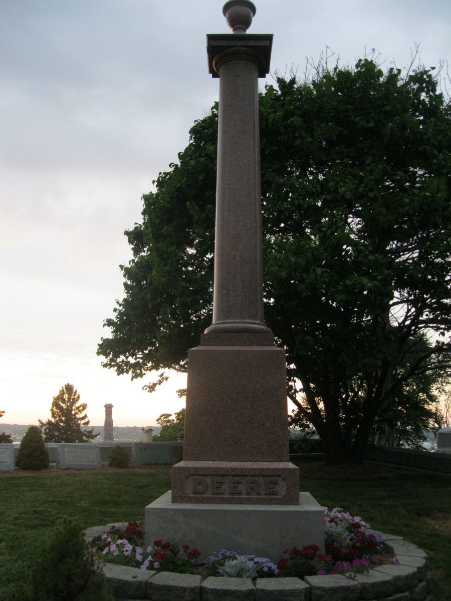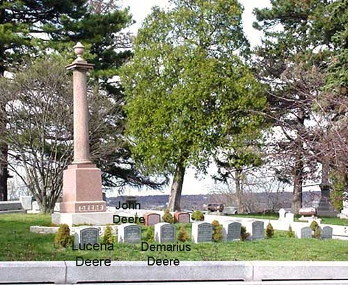 Dos curiosidades respecto a este cementerio, la primera es que este cementerio fue obra de John Deere en momentos que era alcalde de Moline y la segunda es que en ese lugar hay varias lápidas de la familia Deere en un lugar especial que es una rotonda. Pero en el frente de ese memorial, se encuentra la lápida gris de John y pegado y a la derecha esta sepultada Demarius y a la izquierda de John están los restos de Lucenia. Es decir, ambas esposas de John Deere están una cada lado de su sepultura.