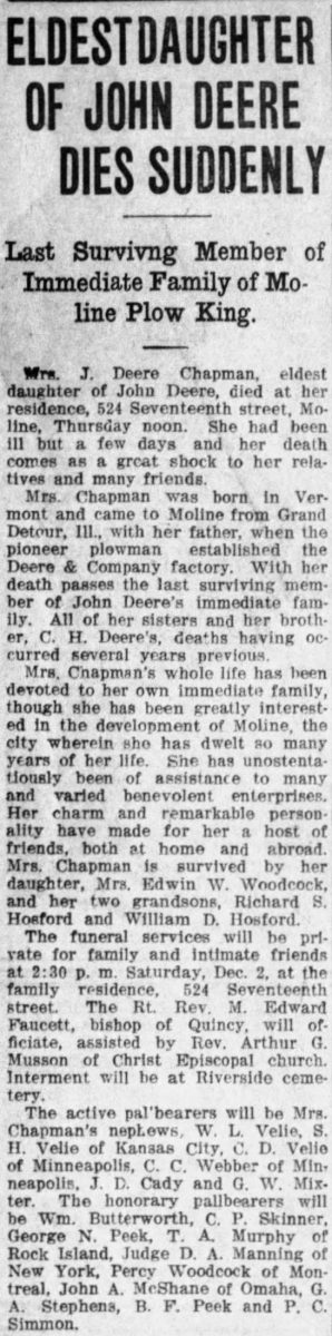 Obituario en momentos del fallecimiento de Lucenia Deere, segunda esposa de John Deere.