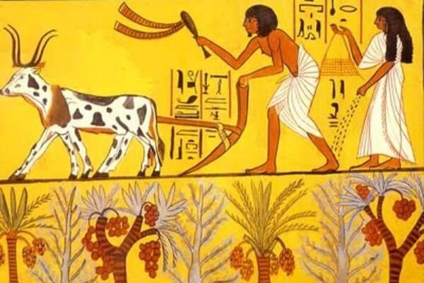 En el Antiguo Egipto, el campesino utiliza su arado tirado por vacas para voltear la tierra sobre el grano. La labranza se hace esencialmente con el azadón, lo que se explica por el hecho de que las tierras aluviales fueron preparadas por la crecida anual del Nilo. Y que la labranza como tal no es absolutamente necesaria.